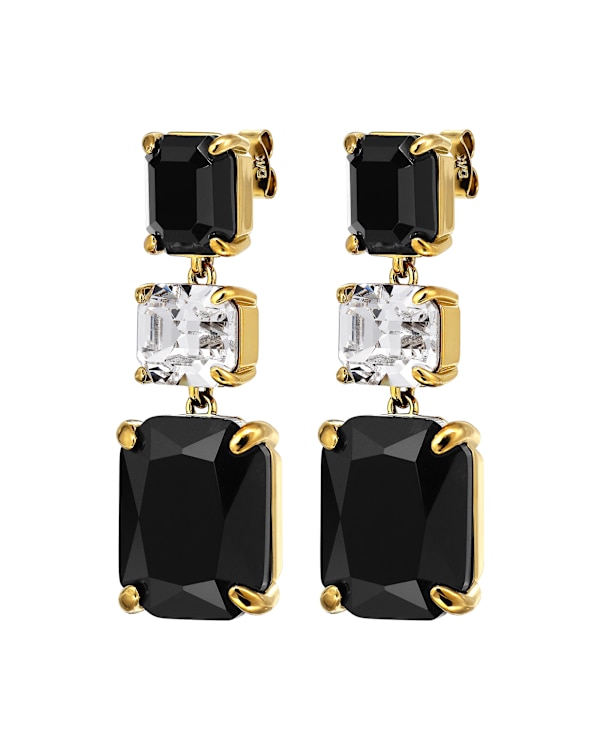 ESMARA - A dramatic and chic Art Deco inspired earring featuring three sparkling emerald cut crystals - set in a modernistic pattern. Surgical steel stud clasp. Total length about 35 mm. Here shown in shiny gold tone with jet black and classic white crystals. DANISH DESIGN - free of cadmium, lead and nickel. - Egenskaber