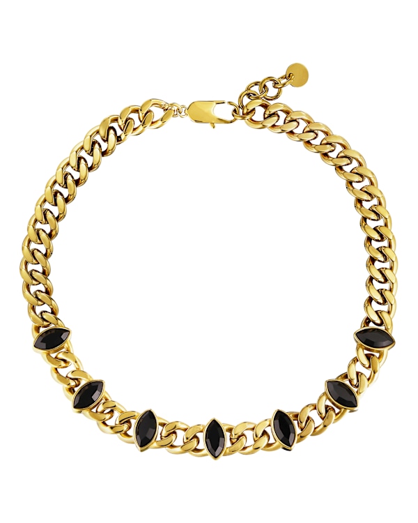 PUNICA is a chunky short necklace that lies beautifully in the neckline with its 42 cm length + 5 cm. extension chain. Super rock`n`roll, attention-grabbing and at the same time wearably modern. The chain jewel is designed in polished steel, and the seven navette-shaped crystals stun and surprise. Wear PUNICA with a simple top or evening dress as you please. Shown here gold-toned version with stones in jet black DANISH DESIGN - free of cadmium, lead and nickel. - Egenskaber